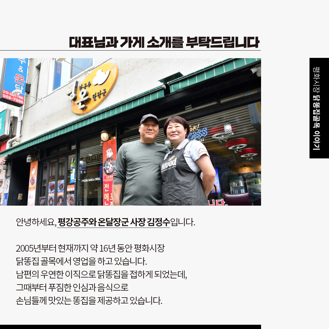 평강공주와온달장군` 은 손님이 모두 평강공주이고 온달장군이라는 마음으로 고객을 맞이하는 똥집 전문점입니다.