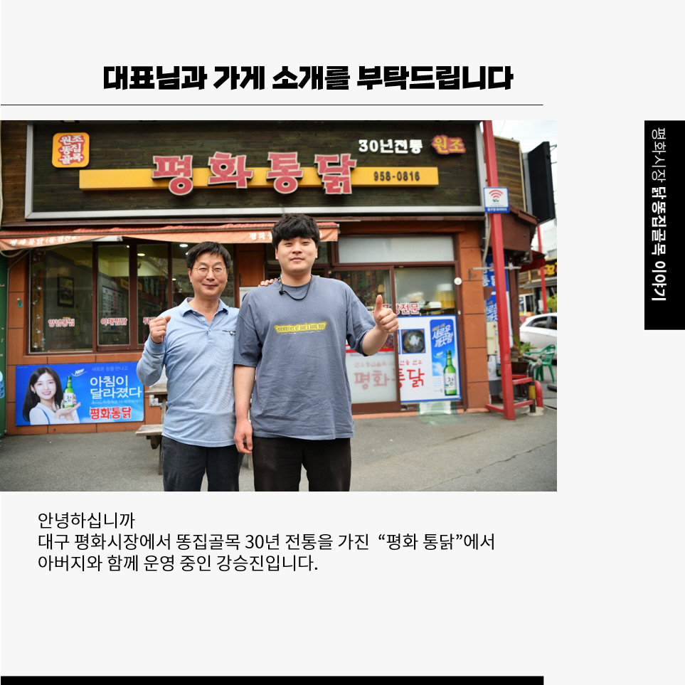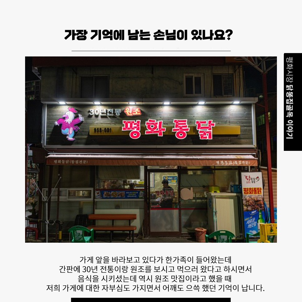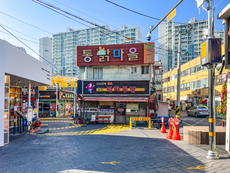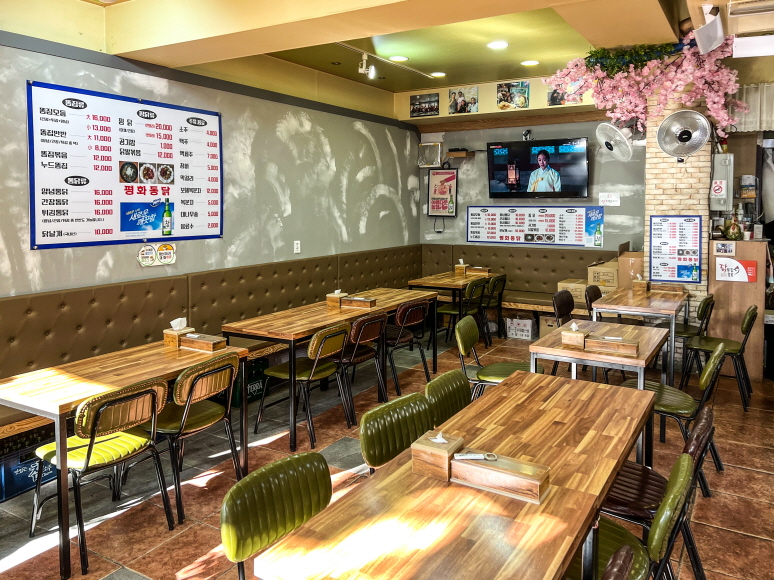 `평화통닭` 은 원조 똥집골목에 위치하고 있는 집으로 40년 전통의 집. 1세대 때부터 있어 왔던 원조 똥집 전문점입니다.