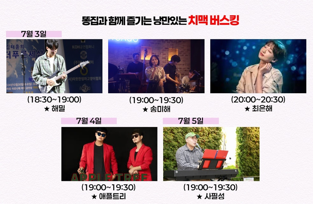 18:30 ~ 19:00 | 치맥가요제 예선 | 소울 치맥버스킹 ‘해밀’ |
